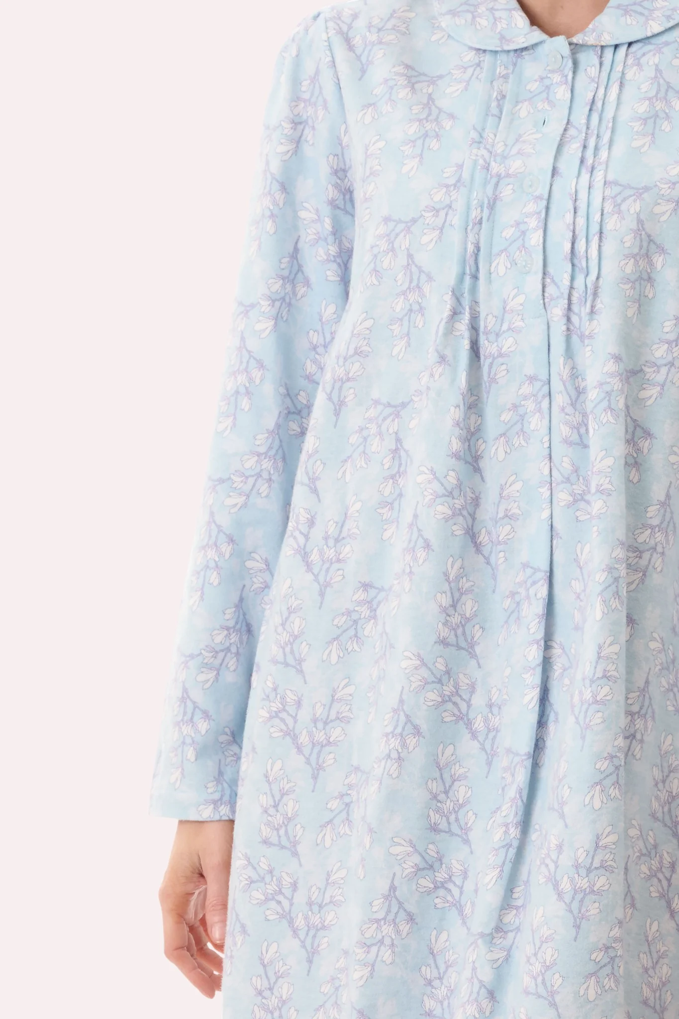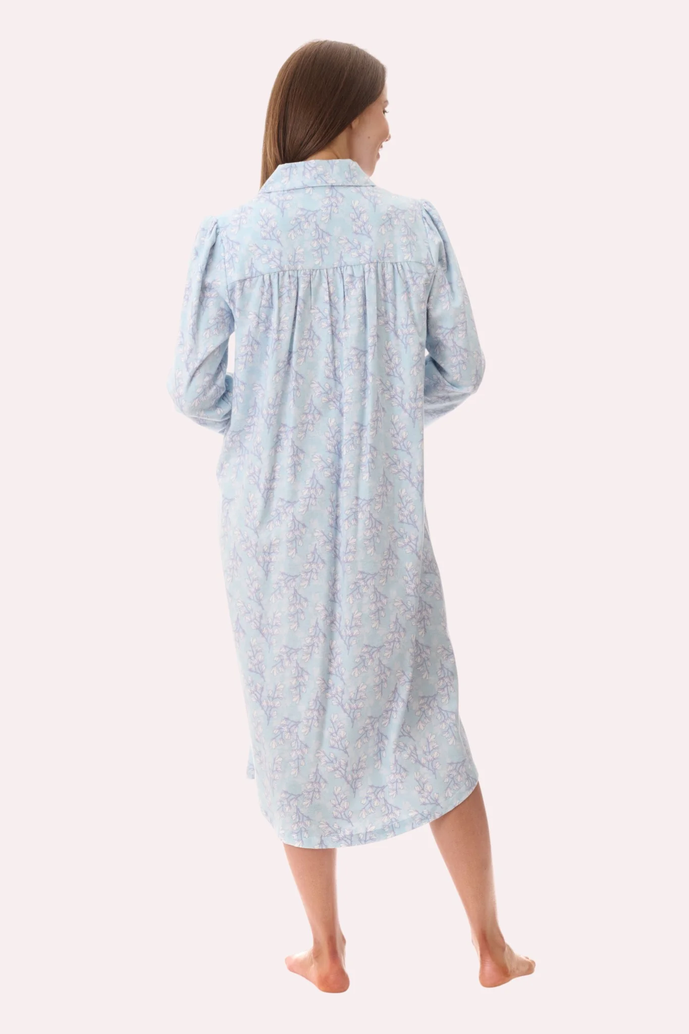 Mid length nightie in the pretty “Jamie” print in mint. Cosy and warm fabric which is ideal for the colder winter nights. Collar and button front opening placket with pintucks. Long sleeves with button closure.