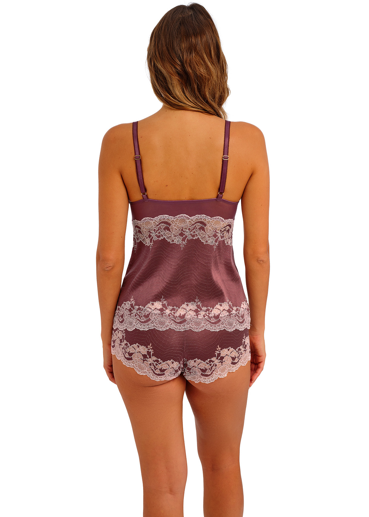 V-neck camisole. Floral lace front and back. Under-bust seam for light support and shaping. Scalloped lace hem. Adjustable straps for a custom fit. Finished length – 63cm. Co-ordinated with cheeky boyshort.